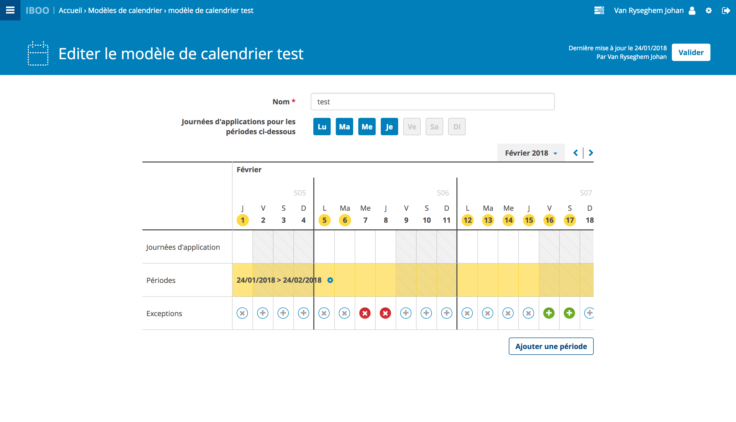 Cette feature active les jours d'application sur les modèles de calendrier, de façon similaire aux calendriers. Cela modifie l'IHM d'édition d'un calendrier.