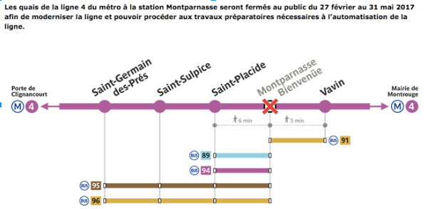 Exemple : Métro Ligne 4 Du 27 février au 31 mai 2017, la mission du métro se verra exclure tout arrêt à la station Montparnasse Bienvenüe, mais desservira l’ensemble des autres stations de l’itinéraire.