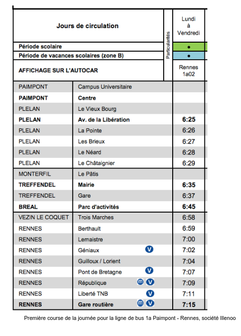 Exemple : Ligne de Bus 1a Paimpont - Rennes, société Illenoo La course définit un passage à 6h25 avenue de la Libération à Plélan, à 6h26 à La Pointe à Plélan et ainsi de suite.
